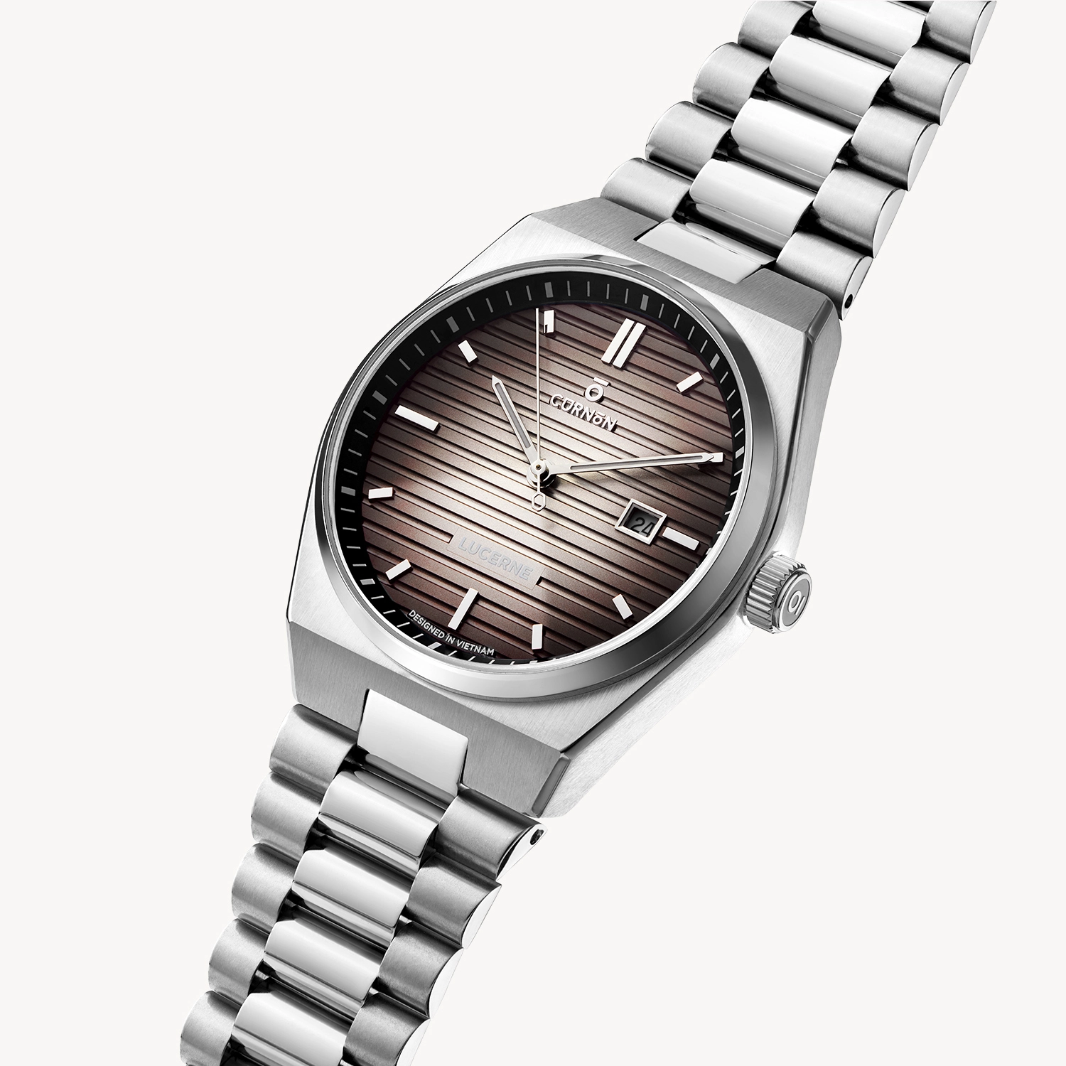Phối màu gradient nâu-đen trên nền dial khắc line chìm tạo nên chiều sâu cuốn hút cho Lucerne Grumber, mang lại vẻ đẹp trầm ổn nhưng vẫn đủ nổi bật, dành cho chàng trai phóng khoáng và chỉn chu trong mọi hoàn cảnh.